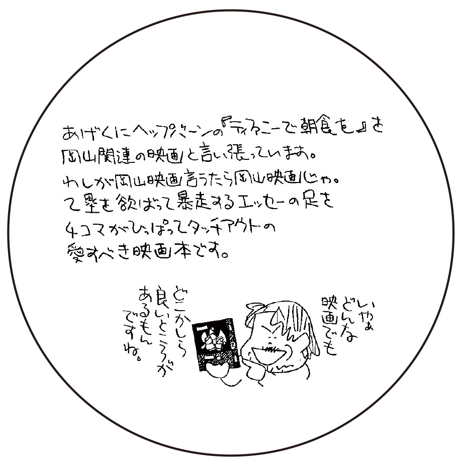 本にもたくさんの作品を描いていただいた上に 蜻文庫HP用のメッセージ画も頂戴しました! クーッ! 菊池晴郎だーッ! 『ティファニーで朝食を』がなぜに岡山関連映画なのか 読む前におわかりになった方はおられるでしょうか? * 『まぁ映画な、岡山じゃ県2』のページへ